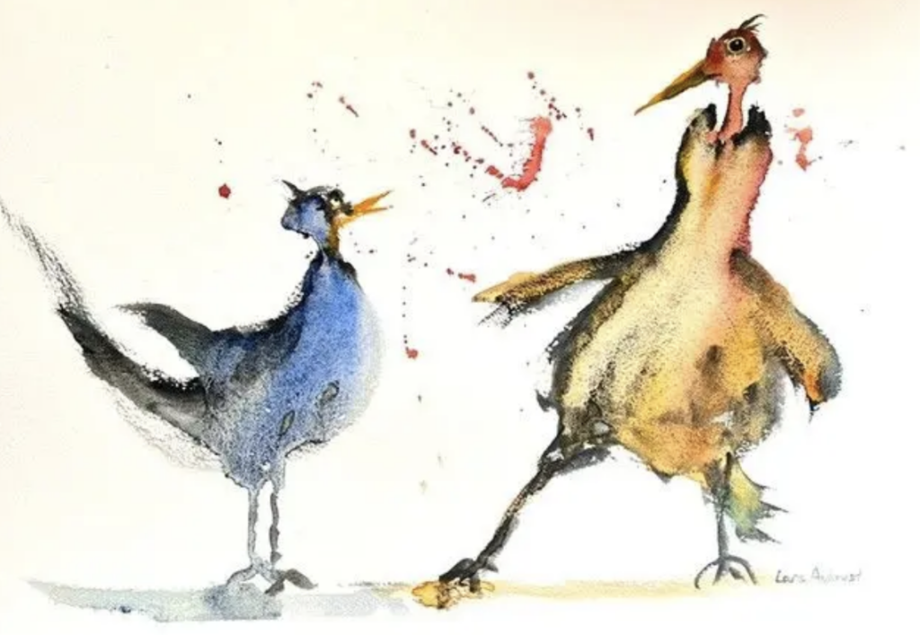 Lars Espen Aukrust er nevø av Kjell Aukrust, og har latt seg inspirere og fascinere av den kjente sangfuglen, svarttrost, og fremstilt den i ulike menneskelige situasjoner. Resultatet er en utstilling med akvareller.